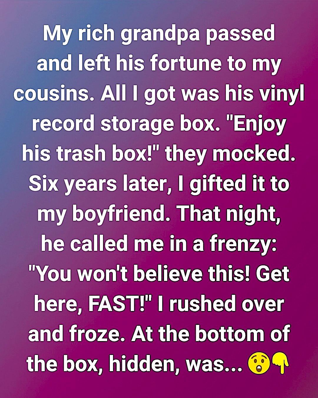Six years passed. I met someone—Ethan, a gentle, curious man who shared my love for music. One evening, seeing how much he enjoyed vinyl, I decided to give him the box. “It belonged to my grandpa,” I told him. “Maybe you’ll get more use out of it than I did.”