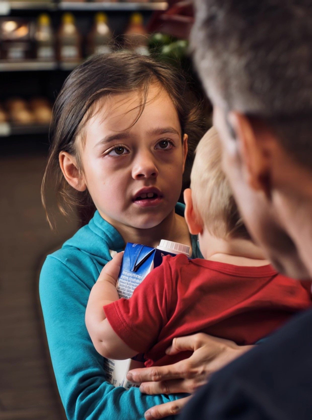 She held her infant brother tightly in one arm, his tiny body pressed against her chest for warmth and comfort. In her other hand, she clutched a carton of milk. Her fingers were small, but they gripped it with quiet determination.