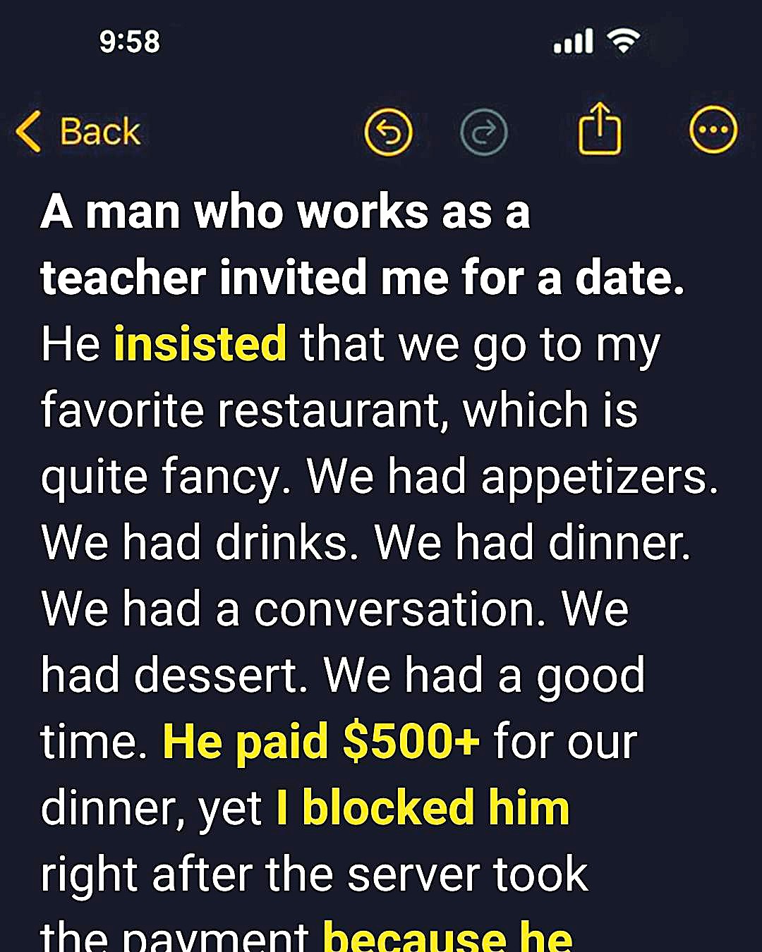 In the end, she learned a lesson: Not every “nice dinner” feels nice when your instincts tell you something is off.