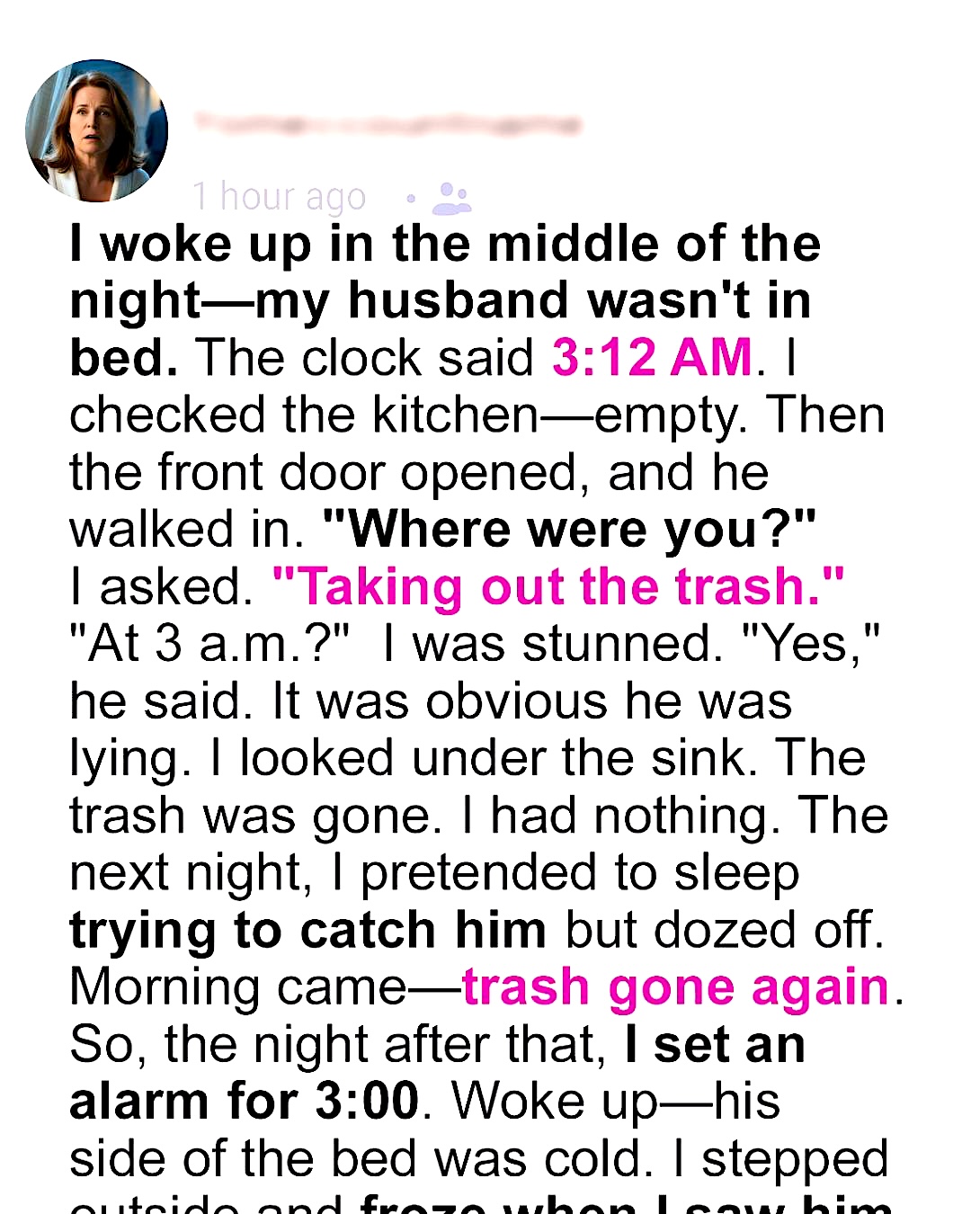 After twenty-two years of marriage, my husband suddenly began taking out the trash at three in the morning. He had never—not once—volunteered for that chore. So why now? One night, I followed him… and what I saw broke my heart in ways I never expected.
