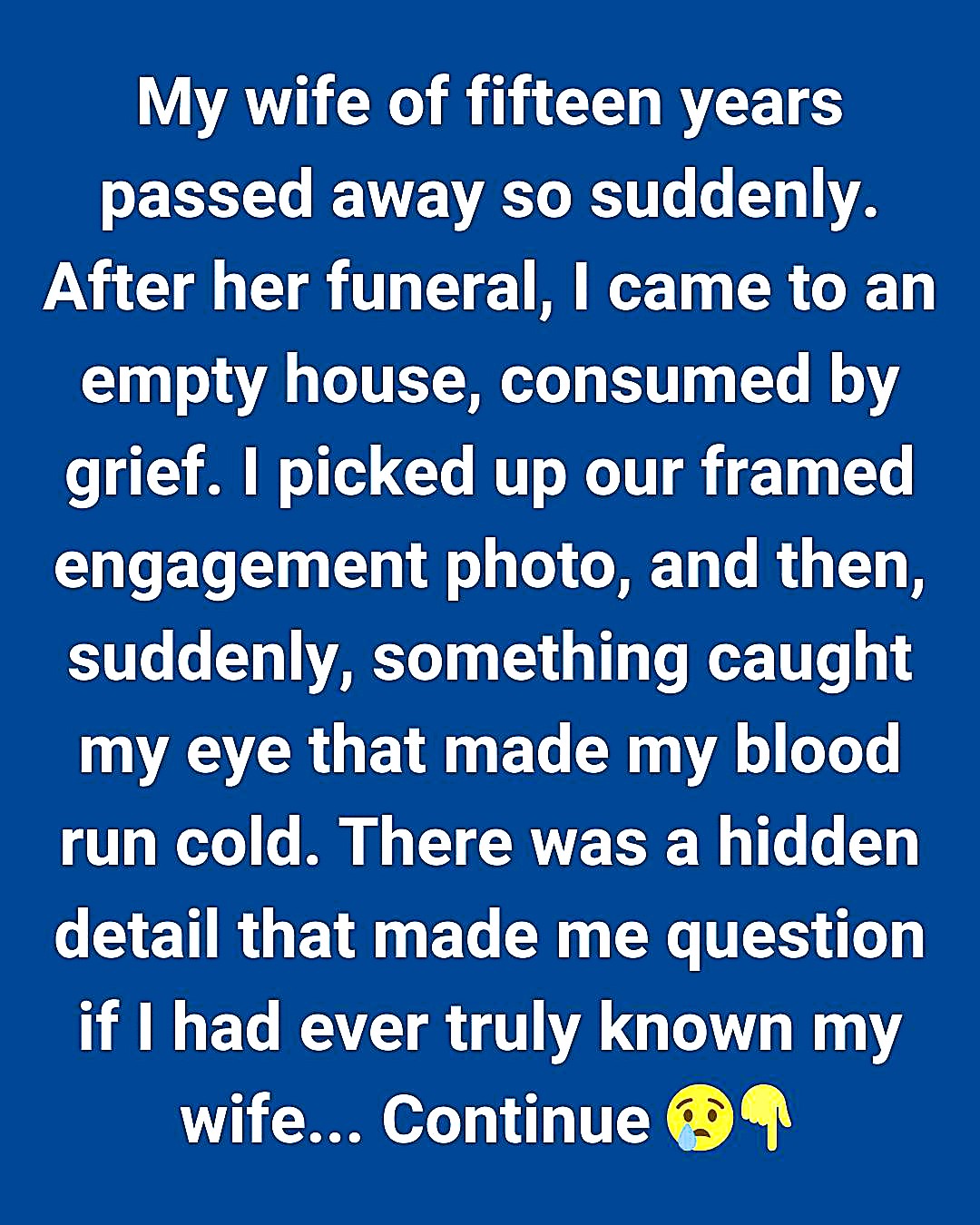 My wife of fifteen years passed away so suddenly. After her funeral, I returned to an empty house, drowning in grief. I picked up our framed engagement photo, only to notice something that made my blood run cold. A hidden detail surfaced—one that made me question if I had ever truly known my wife.