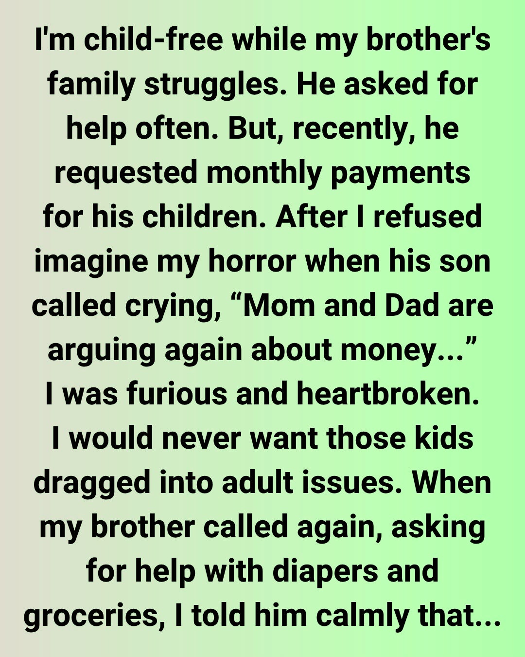 A few days later, his son — my nephew — called me crying, saying, “Mom and Dad are arguing again about money.” I was furious and heartbroken. I would never want those kids dragged into adult issues, especially over something like this.