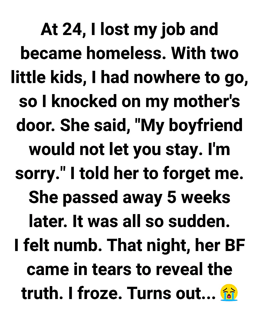 She opened it, looking thinner than I remembered, her eyes tired but still gentle. I told her everything in one breath — how I’d lost my job, how we’d been sleeping in the car, how I had nowhere else to go.
