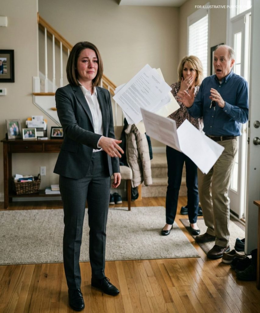 My father turned, holding a stack of papers. “We’re here to make this simple. This house now belongs to us. You should pack up and find somewhere else to live.”